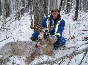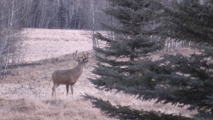 Calvin hunted the buck on private land near agricultural crops. The big buck would not come out till just after shooting light, offering Calvin no shot from his heated pop up blind. One evening, clouds rolled in and the light dwindled earlier than normal. That is all it took to get this Calvin lost no time and settling the cross hairs on the buck and putting him down for good.